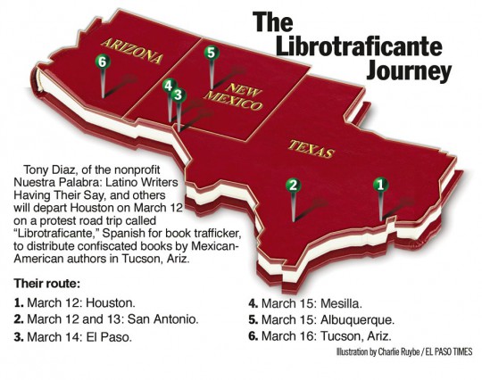 The Spanish term, which means “book smugglers,” is the brainchild of Houston Community College professor and author Tony Diaz, who with a few dozen supporters set out March 12 for Arizona to protest a 2010 state law that prohibits certain types of ethnic studies in public schools. In January officials shut down the Tucson Unified School District’s Mexican-American-studies curriculum. The Librotraficante Caravan traveled through Texas and New Mexico, stopping in cities along the way to hold literary readings, collect donated books, and establish “underground libraries” filled with titles from Tucson’s banned courses. Several authors whose works were discontinued participated—Rudolfo Anaya, widely considered the godfather of Latino literature in the Southwest, even invited the caravan into his Albuquerque home for posole, traditional pork stew.