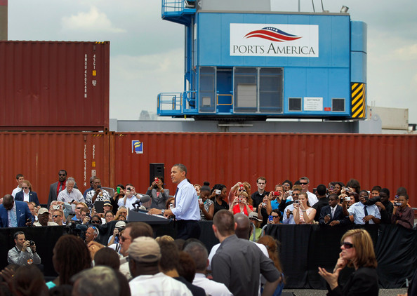 U.S. President Barack Obama speaks during a visit to the Port of Tampa on April 13, 2012 in Tampa, Florida. The President, on his way to the Summit of the Americas in Colombia, used the visit to emphasis small business trade with countries in Latin America.