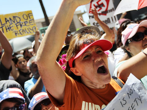 PHOENIX – APRIL 25: Opponents of Arizona‘s new immigration enforcement law protest outside the state capitol building on April 25, 2010 in Phoenix, Arizona. More than 1,000 gathered to protest the passage of Arizona’s tough new law which was signed by the state’s Republican governor Jan Brewer two days before. Critics of the law say that it will encourage racial profiling by law enforcement and endanger civil rights in the state. (Photo by John Moore/Getty Images) Original Filename: GYI0060270245.jpg