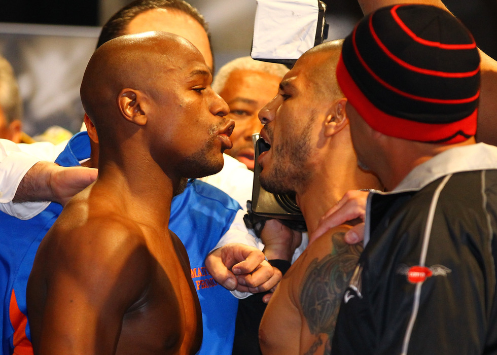 LAS VEGAS, NV – MAY 04: WBA super welterweight champion Miguel Cotto (R) and Floyd Mayweather Jr. face off during the official weigh-in for their bout at the MGM Grand Garden Arena on May 4, 2012 in Las Vegas, Nevada. Cotto will defend his title against Mayweather on May 5, 2012 in Las Vegas. (Photo by Al Bello/Getty Images)