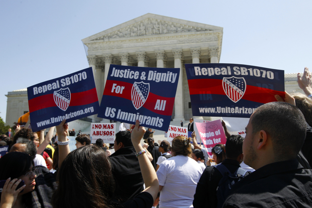 Supporters of immigration reform rally outsode the Supreme Court in Washington, Wednesday, April 25, 2012, where the court held a hearing on Arizona’s “show me your papers” immigration law. (AP Photo/Charles Dharapak)
