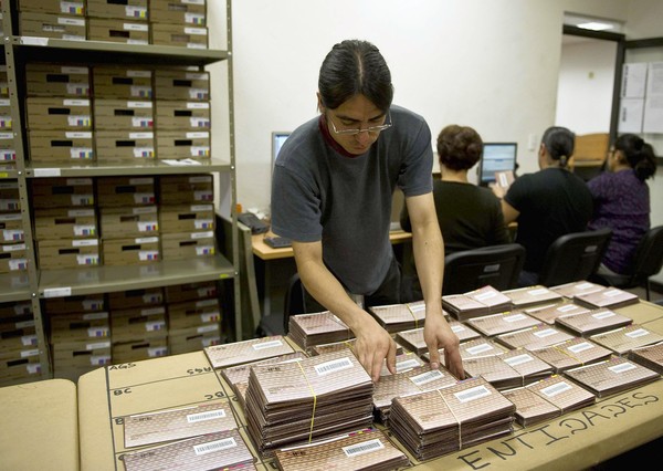 [An employee of the Electoral Federal Institute (IFE) classifies and sorts votes casted by Mexicans living outside Mexico, on June 29, in Mexico city. Mexico will hold presidential elections next July 1. AFP PHOTO/RONALDO SCHEMIDTRonaldo Schemidt/AFP/GettyImages] *** [] ** TCN OUT **
