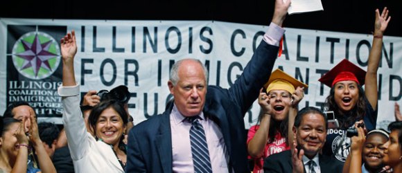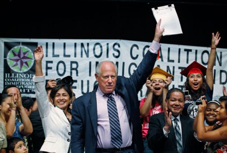 photo source AP/M. SPENCER GREENE Gov. Pat Quinn celebrates with students and supporters after signing the Illinois DREAM Act into law on August 1, 2011.