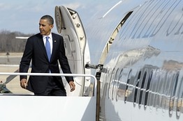 President Barack Obama walks up the steps of Air Force One at Andrews Air Force Base in Md., Thursday, Feb. 23, 2012. Mr. Obama is heading to Florida to visit the University of Miami and attend several fund-raisers. (AP Photo/Susan Walsh)